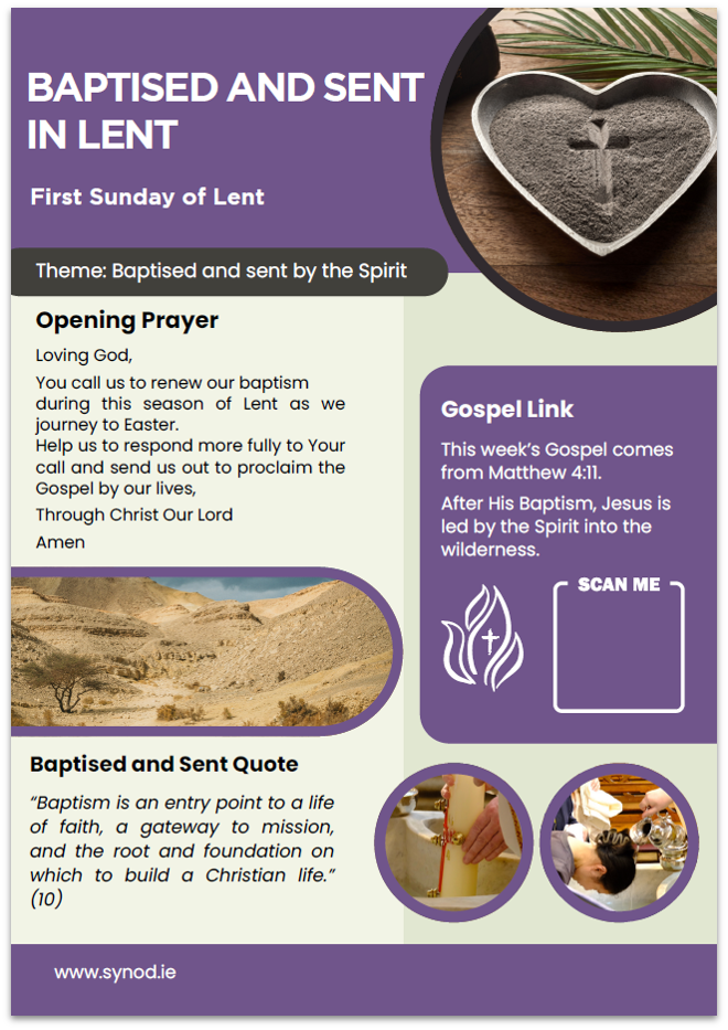 This Lent, parishes, schools and groups across Ireland are invited to journey together through a set of reflective resources inspired by Baptised and Sent. Grounded in the conviction that baptism is the foundation of our identity, dignity and mission, these resources help us return to the heart of Christian life, that through Baptism we are reborn in Christ and sent out by the Spirit in service of the Gospel.